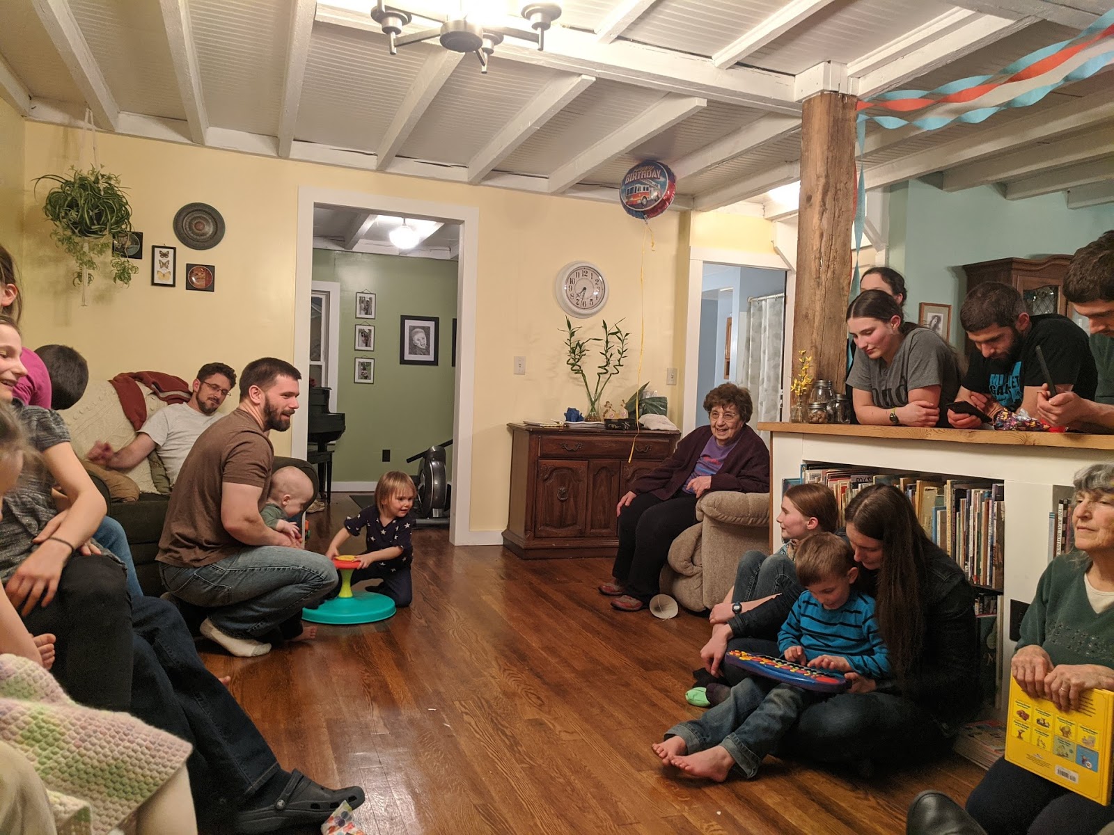 Waiting for the throngs to arrive. Tadhg had been eagerly anticipating so many of his Loved People coming to our house at once. He'd spent a good part of the day running around gleefully shouting, "Happy day!!!" and beaming and jumping like a lunatic when I listed the myriad wonderful people who were coming.